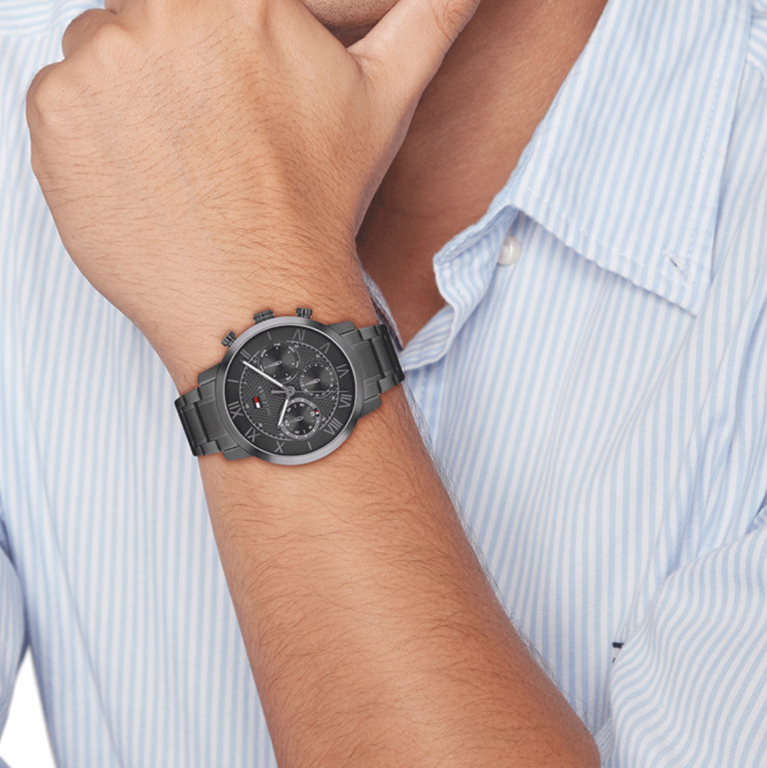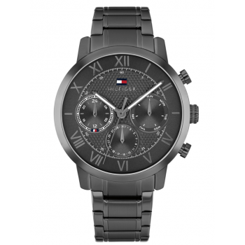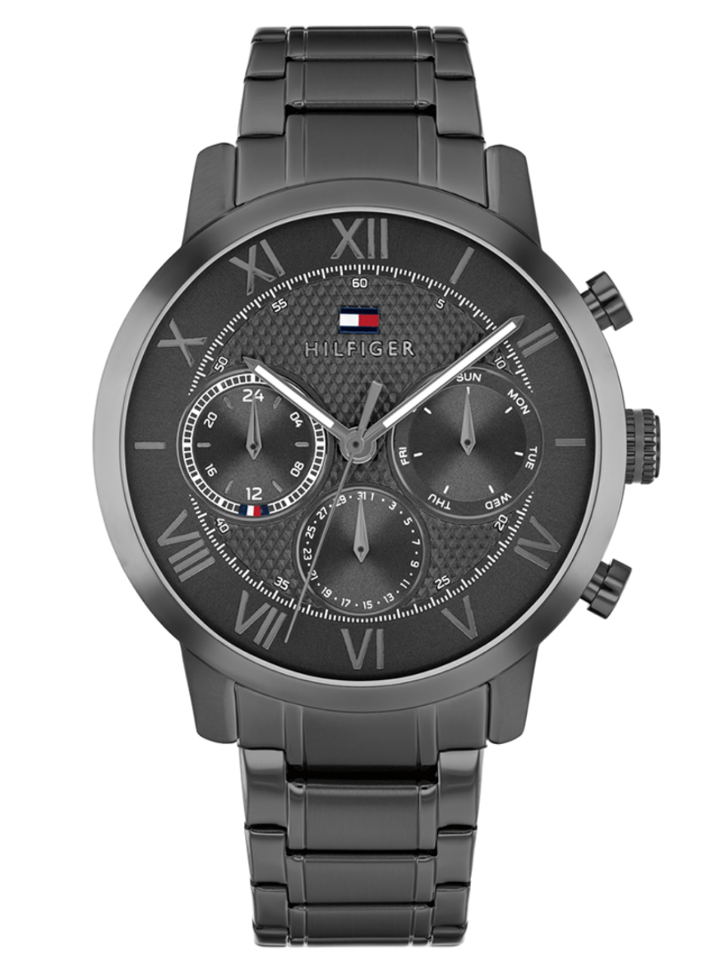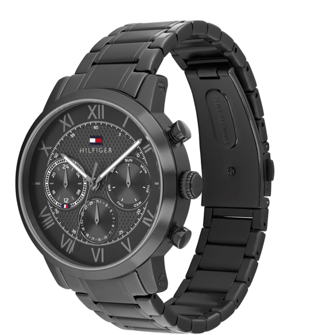 Το ανδρικό ρολόι TOMMY HILFIGER αποτελεί μία fashion επιλογή με premium αισθητική, ιδανική για καθημερινό ντύσιμο αλλά και πιο προσεγμένες εμφανίσεις. Διαθέτει στρογγυλή κάσα 42 mm και μαύρο καντράν, συνδυασμένα με μαύρο μπρασελέ από ανοξείδωτο ατσάλι που προσφέρει αντοχή και άνετη εφαρμογή. Ο μηχανισμός μπαταρίας (Quartz) εξασφαλίζει ακρίβεια, ενώ οι λειτουργίες χρονογράφου, ένδειξης ημέρας και ημερομηνίας ενισχύουν την πρακτικότητα. Το ρολόι προστατεύεται από ορυκτό κρύσταλλο ειδικής σκλήρυνσης και διαθέτει κούμπωμα ασφαλείας για σταθερό κράτημα στον καρπό. Παραδίδεται σε αυθεντική συσκευασία Tommy Hilfiger και συνοδεύεται από 2ετή εγγύηση της εταιρείας/επίσημης αντιπροσωπείας.