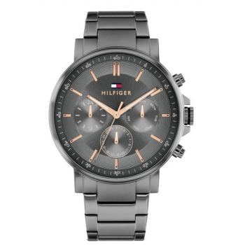 Το ανδρικό ρολόι Tommy Hilfiger Tyson 1710711 συνδυάζει μοντέρνο design και δυναμικό χαρακτήρα, αποτελώντας ιδανική επιλογή για καθημερινή αλλά και πιο κομψή εμφάνιση. Διαθέτει στρογγυλή κάσα από ανοξείδωτο ατσάλι διαμέτρου 44 mm και ανθρακί καντράν, που προσδίδουν premium αισθητική, ενώ το ανθρακί μπρασελέ από ανοξείδωτο ατσάλι προσφέρει άνεση και αντοχή στη χρήση. Το ρολόι προστατεύεται από ορυκτό κρύσταλλο ειδικής σκλήρυνσης για μεγαλύτερη αντοχή σε γρατζουνιές και λειτουργεί με μηχανισμό quartz (μπαταρίας) υψηλής ακρίβειας, προσφέροντας επιπλέον ένδειξη ημέρας/ημερομηνίας και διπλής ώρας. Διαθέτει κούμπωμα ασφαλείας για σταθερή εφαρμογή στον καρπό και αδιαβροχοποίηση 5 ATM / 50 μέτρων. Το προϊόν συνοδεύεται από αυθεντική συσκευασία, πιστοποιητικό γνησιότητας και εγγύηση δύο ετών της επίσημης αντιπροσωπίας Tommy Hilfiger.