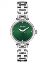 Η κάσα από ανοξείδωτο ατσάλι διαμέτρου 28 mm και πάχους 8 mm χαρίζει διακριτική και θηλυκή αισθητική, ενώ το πράσινο καντράν με κρυστάλλινες λεπτομέρειες προσθέτει μοντέρνο χαρακτήρα. Το ασημί μπρασελέ από ανοξείδωτο ατσάλι με κούμπωμα ασφαλείας εξασφαλίζει άνετη εφαρμογή και σταθερότητα στον καρπό.