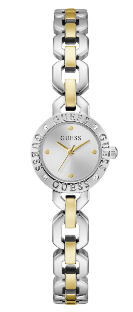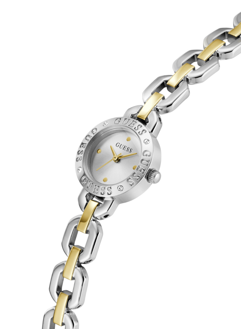 Το GUESS Siren GW1019L3 είναι ένα κομψό γυναικείο ρολόι με μηχανισμό Quartz ακριβείας και λεπτή κάσα 23mm. Διαθέτει λευκό καντράν με χρυσούς δείκτες και λεπτομέρειες, διακοσμημένο με πέτρες για έξτρα λάμψη. Η κάσα είναι ασημί από ανακυκλωμένο ατσάλι και προστατεύεται από ορυκτό κρύσταλλο ειδικής σκλήρυνσης. Το μπρασελέ από ανακυκλωμένο ατσάλι σε δίχρωμο ασημί/χρυσό ολοκληρώνεται με κούμπωμα G-LINK για σταθερή εφαρμογή. Συνοδεύεται από αυθεντικό κουτί GUESS και επίσημη εγγύηση 2 ετών.