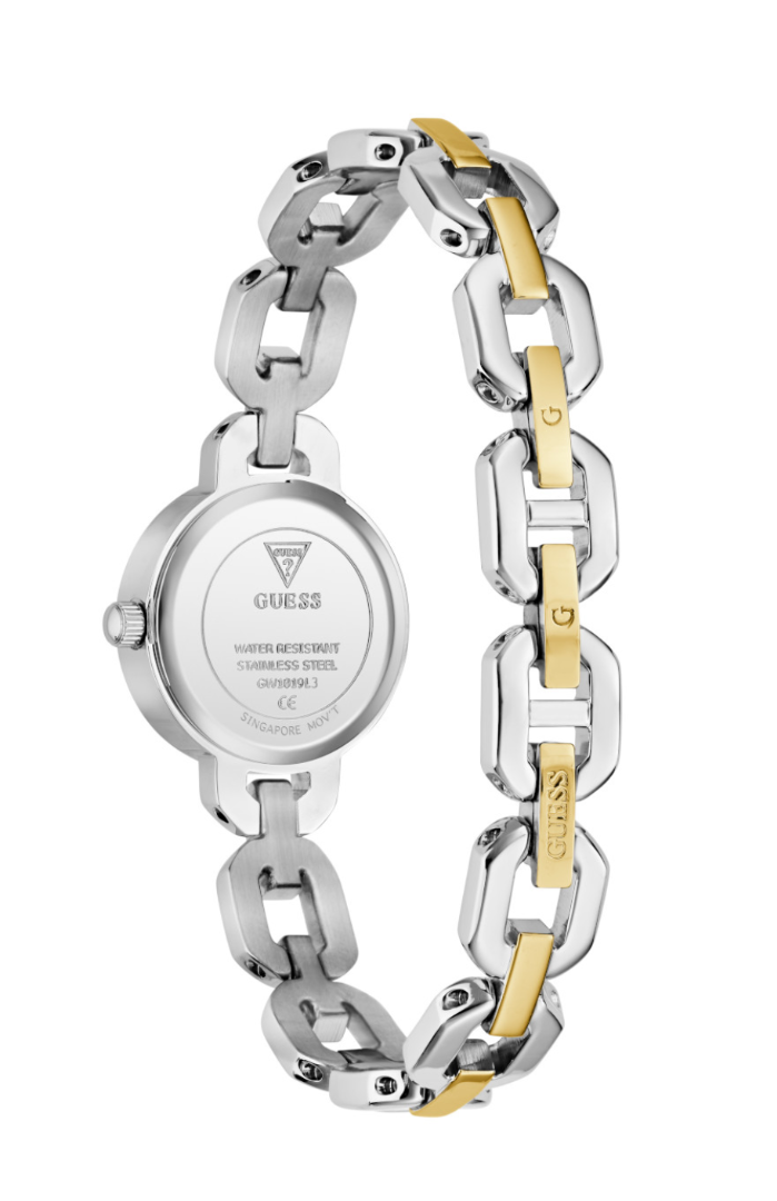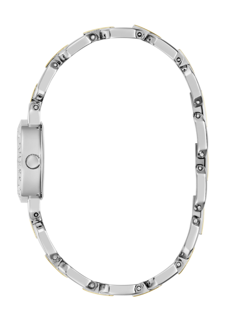 GUESS Siren GW1019L3 Γυναικείο Ρολόι Quartz Ακριβείας 23mm με Ανακυκλωμένο Ατσάλινο Μπρασελέ, Λευκό Καντράν με Πέτρες, Ασημί/Χρυσό