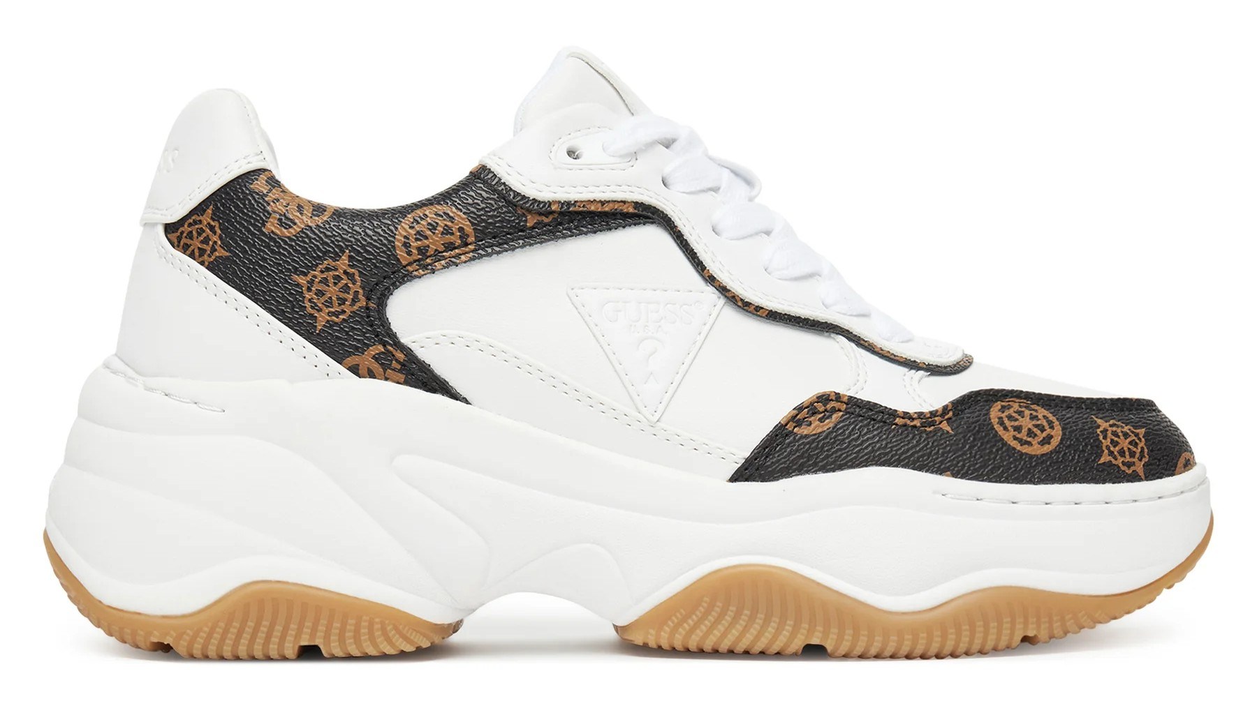 Γυναικεία sneakers Guess FLTHPYFAL12 WHIBR σε λευκή απόχρωση με καφέ λεπτομέρειες σχεδιασμένα για καθημερινές casual και urban εμφανίσεις με έντονο fashion χαρακτήρα