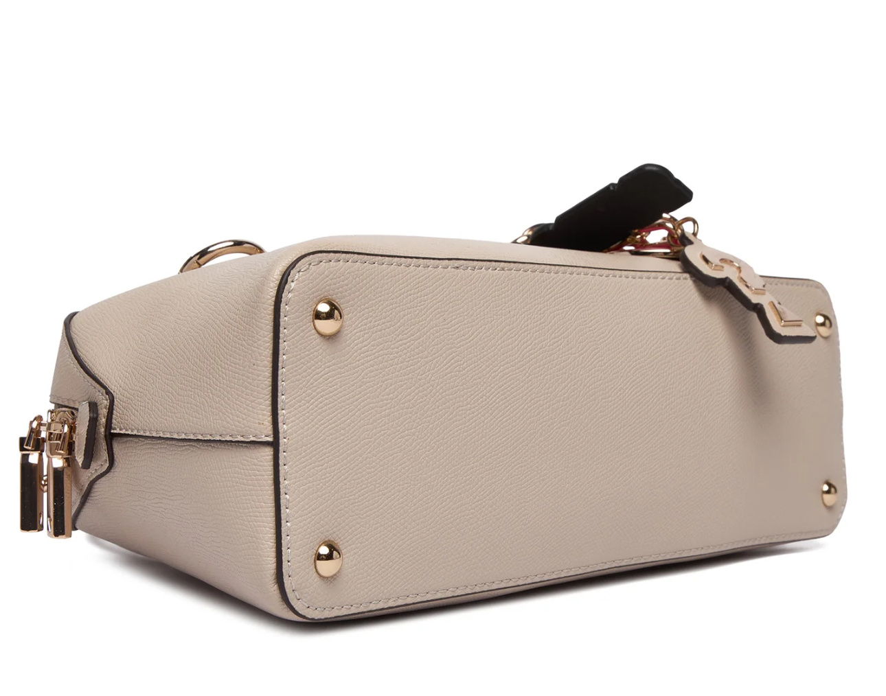 Η τσάντα διαθέτει κομψή χειρολαβή για μεταφορά στο χέρι, καθώς και ρυθμιζόμενο και αποσπώμενο λουράκι ώστε να μπορεί να φορεθεί άνετα στον ώμο ή χιαστί. Η διακοσμητική αλυσίδα και τα μεταλλικά πόδια στη βάση προσθέτουν στυλ και προστατεύουν την τσάντα από φθορές. Περιλαμβάνεται επίσης υφασμάτινο πουγκί φύλαξης για προστασία από τη σκόνη.